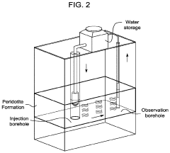 - Injecting solubilized carbon dioxide into peridotite rock formations under controlled temperature and pressure conditions, utilizing water to enhance reaction pathways and convert CO2 into stable carbonate minerals like magnesite and calcite, leveraging renewable energy sources for the process.